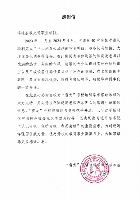4月15日,“雪龍”號極地科考船順利返航回家,靠泊在位于上海外高橋的中國極地科考國內(nèi)基地碼頭,圓滿完成中國第40次南極考察任務(wù)。我院選派陳曉凌老師赴“雪龍”號船,參加了中國第40次南極考察。
