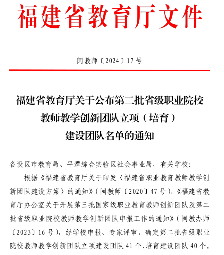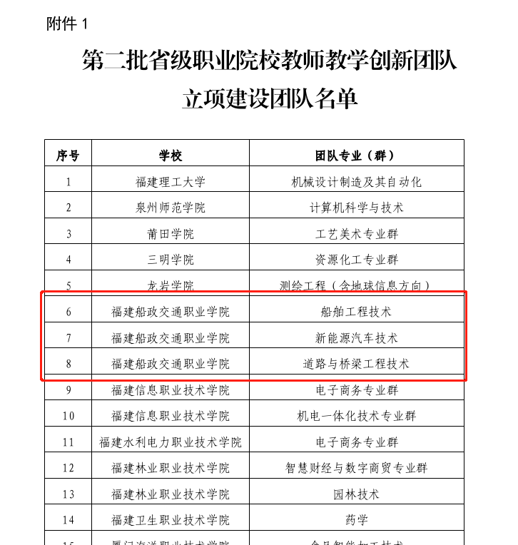 近日,福建省教育廳印發(fā)《關(guān)于公布第二批省級(jí)職業(yè)院校教師教學(xué)創(chuàng)新團(tuán)隊(duì)立項(xiàng)(培育)建設(shè)團(tuán)隊(duì)名單的通知》,確定第二批省級(jí)職業(yè)院校教師教學(xué)創(chuàng)新團(tuán)隊(duì)立項(xiàng)建設(shè)團(tuán)隊(duì)41個(gè)、培育建設(shè)團(tuán)隊(duì)40個(gè)。我院船舶工程技術(shù)、新能源汽車技術(shù)、道路與橋梁工程技術(shù)等三個(gè)團(tuán)隊(duì)入選省級(jí)職業(yè)院校教師教學(xué)創(chuàng)新團(tuán)隊(duì)立項(xiàng)建設(shè)團(tuán)隊(duì)。