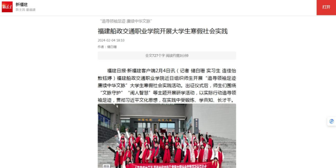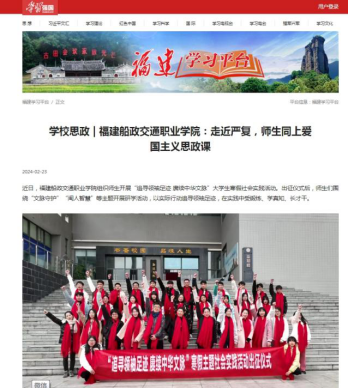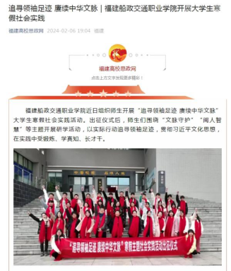 學(xué)院認(rèn)真落實(shí)福建省委教育工委要求,統(tǒng)籌部署、協(xié)同開展“追尋領(lǐng)袖足跡 賡續(xù)中華文脈”大學(xué)生寒假社會實(shí)踐,成立社會實(shí)踐隊(duì),走進(jìn)嚴(yán)復(fù)故居、嚴(yán)復(fù)博物館等場所,開展“文脈守護(hù)”“閩人智慧”等主題開展研學(xué)活動,把“小我”融入到“大我”,在社會實(shí)踐中堅(jiān)定前行方向、找準(zhǔn)人生坐標(biāo)、扛起責(zé)任擔(dān)當(dāng)。本次主題社會實(shí)踐活動得到學(xué)習(xí)強(qiáng)國福建學(xué)習(xí)平臺、福建高校思政網(wǎng)、新福建等多家媒體報(bào)道,取得了良好的育人成效和社會認(rèn)可。