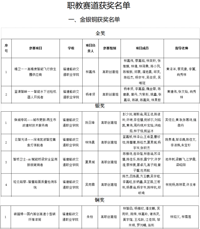近日,根據(jù)“福建省教育廳關(guān)于公布福建省大學(xué)生創(chuàng)新大賽(2025)獲獎名單的通知(閩教高〔2025〕20號)”文件,我院在本屆大賽中榮獲2金6銀3銅的成績。其中,藍(lán)淵智眸——智能水下巡檢機(jī)器人開拓者和精衛(wèi)——高精度智能飛行救生圈供應(yīng)商兩個項目獲得福建省大學(xué)生創(chuàng)新大賽(2025)(職教賽道)金獎;砼筑綠夢——建筑垃圾多源骨料集約化智配平臺構(gòu)建與產(chǎn)業(yè)化應(yīng)用項目獲得產(chǎn)業(yè)命題賽道銀獎;石厝衛(wèi)士——海岸石厝民居文化守護(hù)者項目獲得高教主賽道銀獎。