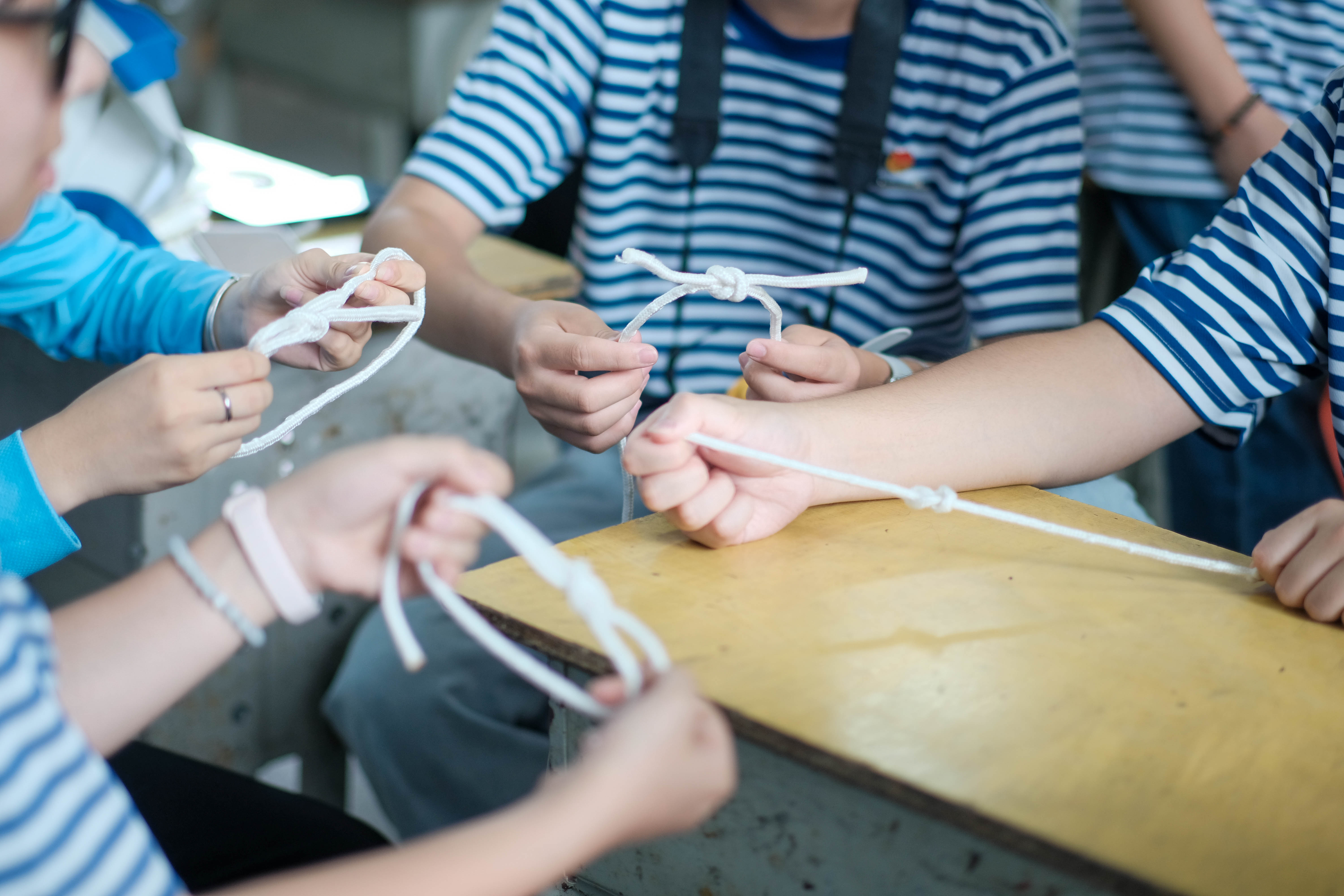 “大家看,這個(gè)‘丁香結(jié)’能牢牢系住桅桿,在大風(fēng)浪里也不會(huì)松動(dòng)!” “山海呼喚 船啟童窗” 實(shí)踐隊(duì)隊(duì)員手中的繩子仿佛有了生命,三繞兩纏便化作一個(gè)結(jié)實(shí)的繩結(jié)。課堂上,孩子們瞪大好奇的眼睛,跟著隊(duì)員們的示范擺弄手中的彩繩。