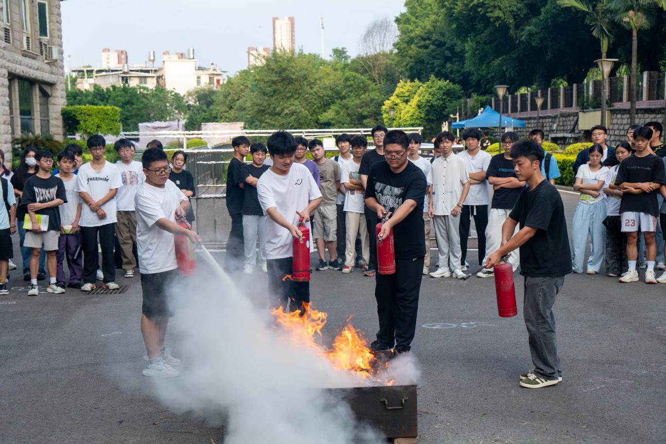 隨著警報聲響起,活動第二部分實戰(zhàn)演練拉開序幕,同學們配合引導人員按照預設路線有序從消防通道撤離到創(chuàng)新樓外安全地點,演練整體過程有條不紊。隨后,工作人員向大家演示了消防器材的正確用法,同學們積極參與其中,通過實踐掌握滅火器的基本用法,將安全意識內化為本能反應,構建“消防始于行,安全植于心”的校園安全氛圍。