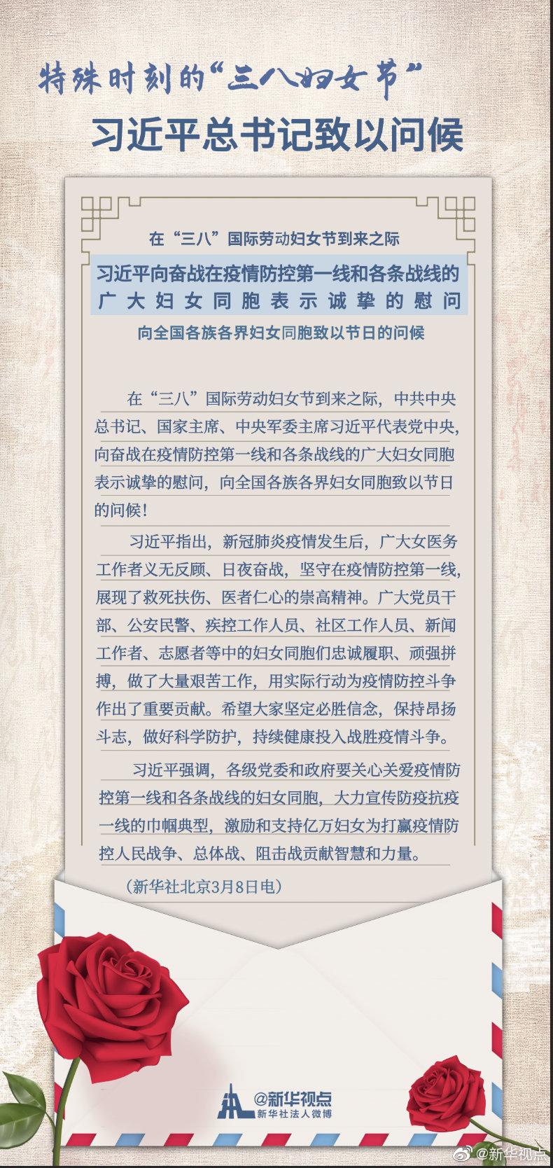 習(xí)近平強(qiáng)調(diào),各級黨委和政府要關(guān)心關(guān)愛疫情防控第一線和各條戰(zhàn)線的婦女同胞,大力宣傳防疫抗疫一線的巾幗典型,激勵(lì)和支持億萬婦女為打贏疫情防控人民戰(zhàn)爭、總體戰(zhàn)、阻擊戰(zhàn)貢獻(xiàn)智慧和力量。