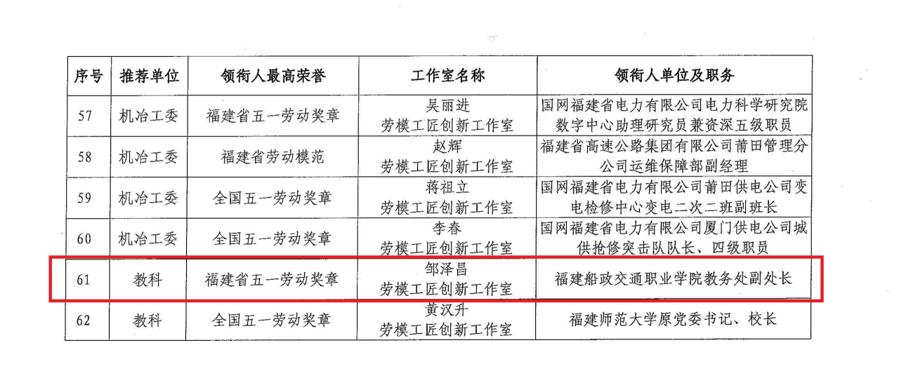 日前,福建省總工會(huì)公布了《關(guān)于確認(rèn)福建省勞模工匠創(chuàng)新工作室的通知》,我院鄒澤昌副教授領(lǐng)銜的市級(jí)勞模和工匠人才創(chuàng)新工作室成功獲批“福建省勞模工匠創(chuàng)新工作室”,這是我院首個(gè)福建省勞模工匠創(chuàng)新工作室。