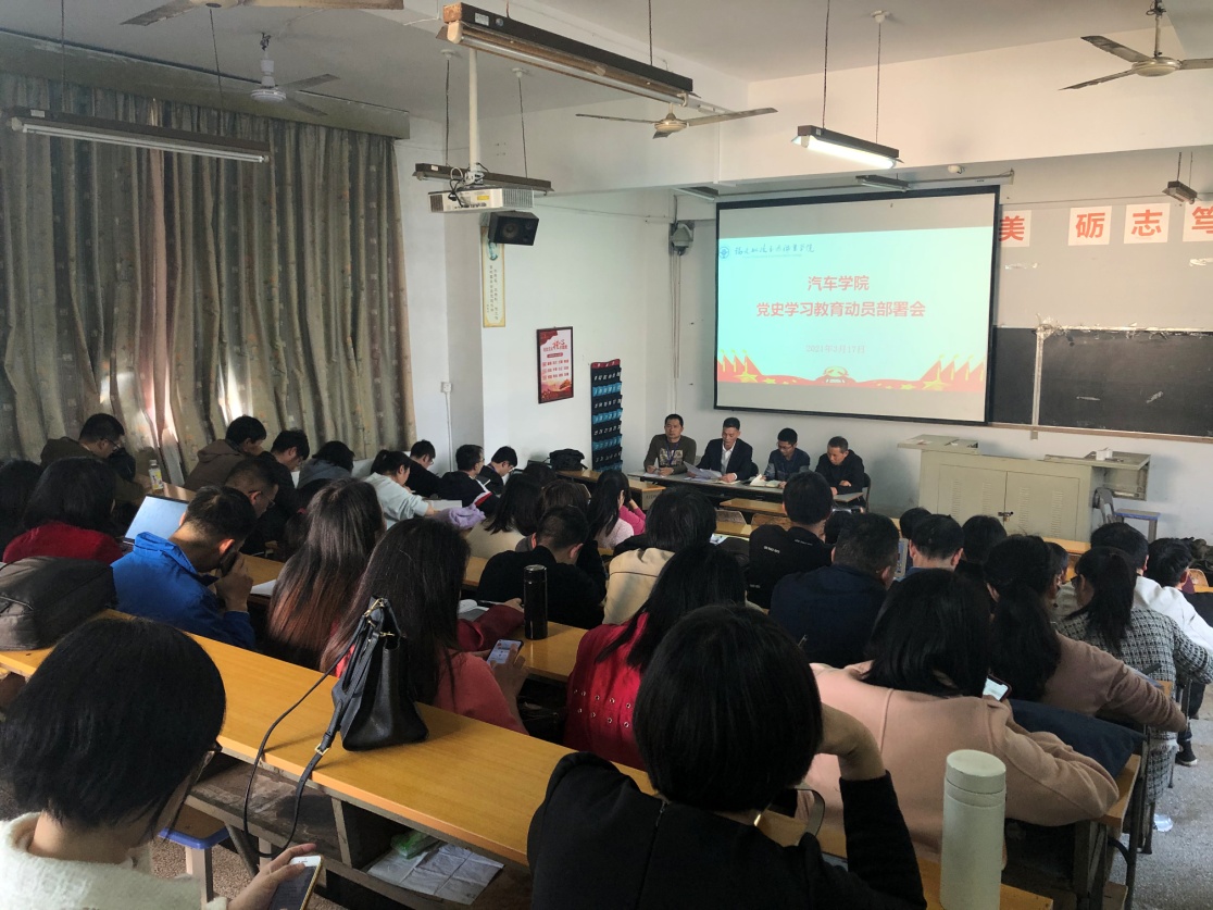 2021年3月17日下午,汽車學院黨總支在22號樓二階召開黨史學習教育動員部署會,學習貫徹習近平總書記在黨史學習教育動員大會上的重要講話精神,傳達了學校關于全面開展黨史學習教育部署動員大會會議精神。學院領導班子成員、全體黨員等參加會議。