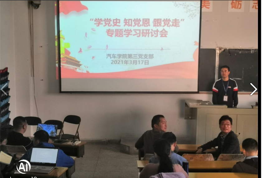 根據(jù)學(xué)院“再學(xué)習(xí)、再調(diào)研、再落實(shí)”活動(dòng)工作部署要求,深入開展黨史學(xué)習(xí)教育,2021年3月17日下午,汽車學(xué)院第三黨支部于汽西22號樓第二階梯教室教室開展“學(xué)黨史 知黨恩 跟黨走”專題學(xué)習(xí)研討會(huì)。