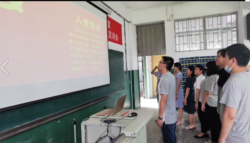 為了迎接黨的100周歲生日,由支部書記朱劍寶同志帶領(lǐng)大家重溫入黨誓詞,本支部最年輕的黨員黃丹粟同志作為青年教師代表重溫入黨志愿書。拉開了本次學(xué)習(xí)活動的序幕。與往常不同的開場方式將本次學(xué)習(xí)活動推向一個小高潮,充分調(diào)動了黨員學(xué)習(xí)的熱情。