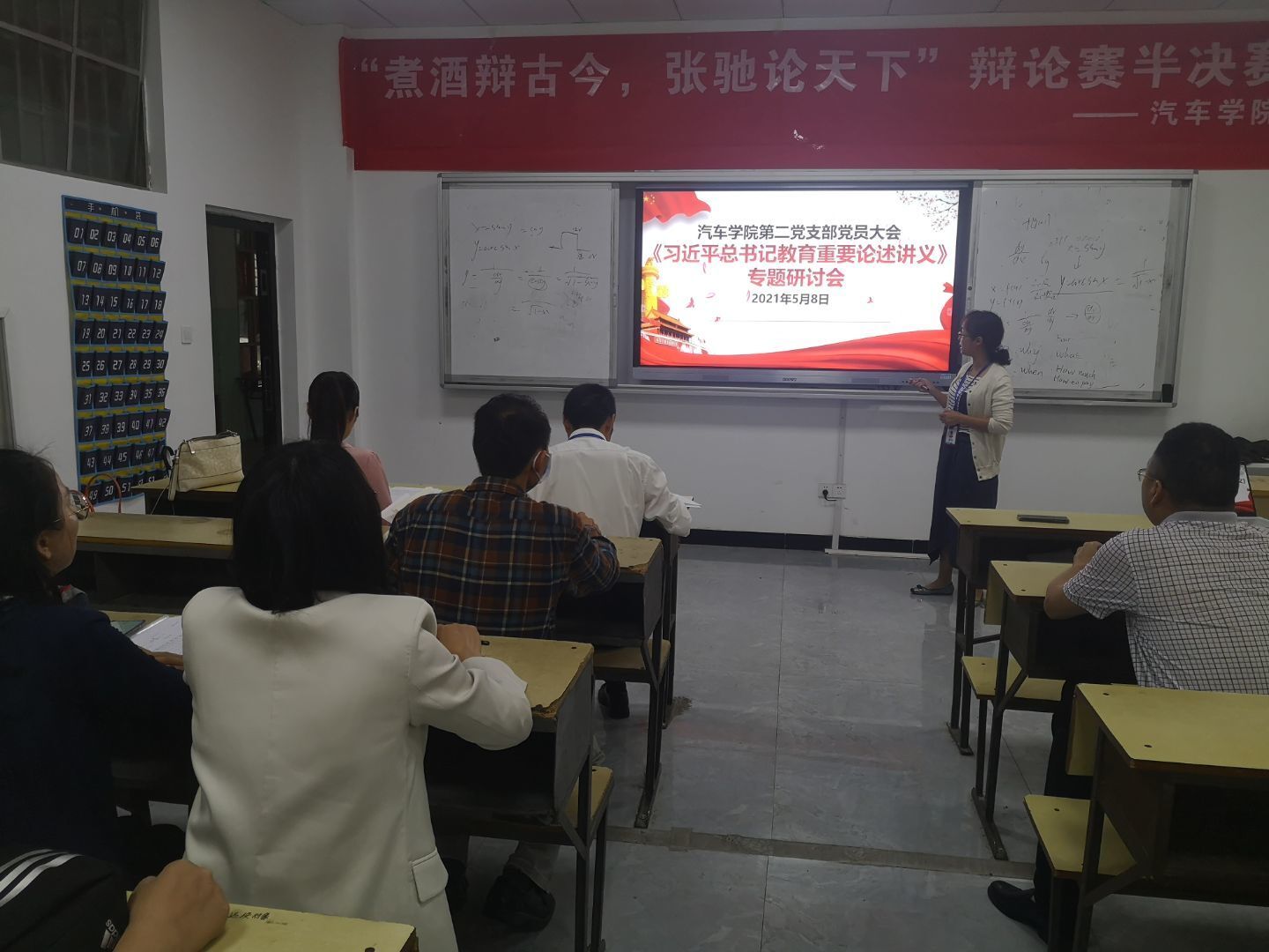 5月8日,汽車學(xué)院第二黨支部舉辦“重溫習(xí)近平總書記對教師說的暖心話,把握新時(shí)代教育工作要點(diǎn)” 集中學(xué)習(xí)《習(xí)近平總書記教育重要論述講義》專題研討會。