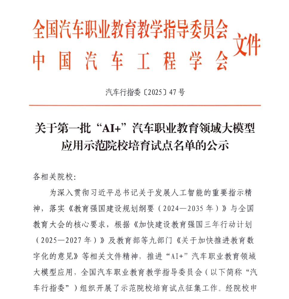為深入貫徹落實習(xí)近平總書記關(guān)于發(fā)展人工智能的重要指示精神,落實全國教育大會精神和《教育強國建設(shè)規(guī)劃綱要(2024-2035年)》要求,根據(jù)《加快建設(shè)教育強國三年行動計劃(2025-2027年)》及教育部等九部門《關(guān)于加快推進教育數(shù)字化的意見》等文件精神,在人工智能技術(shù)全面賦能職業(yè)教育發(fā)展的新階段,我院積極推進人工智能技術(shù)深度賦能職業(yè)教育,近期成功獲批兩項全國汽車行指委第一批“‘AI+’汽車職業(yè)教育大模型應(yīng)用示范院校培育試點”和“人工智能+汽車通識教育試點院?!?。