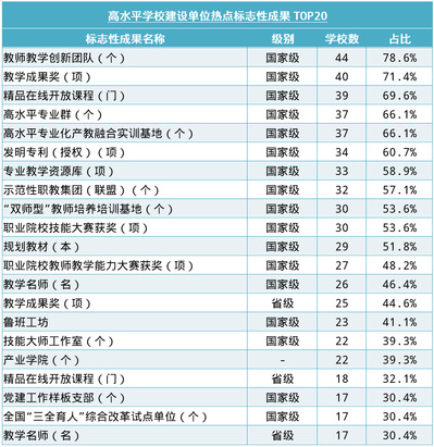 從統(tǒng)計(jì)數(shù)據(jù)來(lái)看,國(guó)家級(jí)教師教學(xué)創(chuàng)新團(tuán)隊(duì)成為“雙高計(jì)劃”56所高水平學(xué)校建設(shè)單位標(biāo)志性成果最熱詞匯,44所院校(78.6%)均將建設(shè)國(guó)家級(jí)教師教學(xué)創(chuàng)新團(tuán)隊(duì)列為標(biāo)志性成果;其次是國(guó)家教學(xué)成果獎(jiǎng)、國(guó)家精品在線開放課程、國(guó)家高水平專業(yè)群、國(guó)家高水平專業(yè)化產(chǎn)教融合實(shí)訓(xùn)基地,分列第2至第5位,超過(guò)60%的院校標(biāo)志性成果中涵蓋了這些指標(biāo)。
