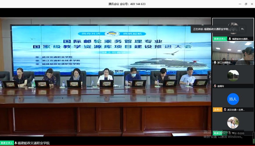 2020年7月10日,學(xué)院聯(lián)合武漢交通職業(yè)學(xué)院和浙江交通職業(yè)技術(shù)學(xué)院共同主持召開職業(yè)教育國(guó)際郵輪乘務(wù)管理專業(yè)國(guó)家級(jí)教學(xué)資源庫(kù)項(xiàng)目建設(shè)工作推進(jìn)大會(huì)。由于新冠肺炎疫情防控常態(tài)化的需要,本次會(huì)議在騰訊會(huì)議網(wǎng)絡(luò)平臺(tái)上召開,學(xué)院陳艷紅副院長(zhǎng)、航海技術(shù)系江明光主任協(xié)同資源庫(kù)各課程負(fù)責(zé)人共同參會(huì)。來(lái)自行業(yè)企業(yè)的專家和各參建單位代表共計(jì)一百三十多人,以個(gè)人連線的方式加入線上會(huì)議。