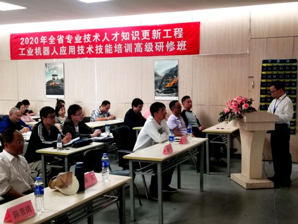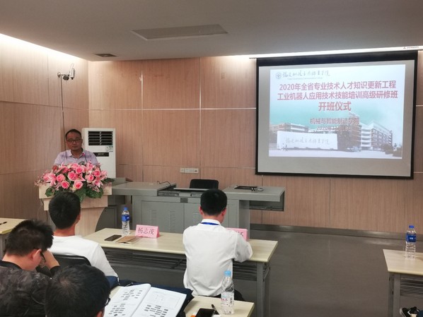 楊開懷院長首先對(duì)參加開班儀式的領(lǐng)導(dǎo)和嘉賓表示歡迎,對(duì)給予此次培訓(xùn)技術(shù)支持的福建閩大科技有限公司表示感謝。接著介紹了機(jī)械與智能制造學(xué)院工業(yè)機(jī)器人專業(yè)的歷史沿革,以及工業(yè)機(jī)器人應(yīng)用技術(shù)領(lǐng)域近年來的發(fā)展前景,我院在工業(yè)機(jī)器人專業(yè)課程優(yōu)化、實(shí)驗(yàn)室建設(shè)、技能競(jìng)賽等方面取得的優(yōu)異成績,并努力致力于為我省乃至全國的工業(yè)機(jī)器人行業(yè)培養(yǎng)高素質(zhì)技能人才。