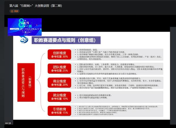 為確保培訓(xùn)的正常進(jìn)行,創(chuàng)新創(chuàng)業(yè)學(xué)院主動聯(lián)系各職業(yè)院校了解需求,尋找合適的線上培訓(xùn)平臺,組織報(bào)名,對接專家,安排課程,盡心盡力做好集訓(xùn)準(zhǔn)備工作。在大家共同努力下,三天四場的線上培訓(xùn)順利完成。每場講座全省職業(yè)院校和應(yīng)用型本科院校師生踴躍參加,培訓(xùn)組織有序,線上授課順暢,討論互動環(huán)節(jié)氣氛熱烈,參訓(xùn)的師生表示:本次集訓(xùn)營讓大家對“互聯(lián)網(wǎng)+”大學(xué)生創(chuàng)新創(chuàng)業(yè)大賽的政策有了更加直觀體會和準(zhǔn)確認(rèn)知,明確了大賽項(xiàng)目培育的重點(diǎn)和核心邏輯,提升了項(xiàng)目團(tuán)隊(duì)的參賽信心,為下一階段校賽和省賽打下良好基礎(chǔ)。培訓(xùn)結(jié)束,我們還安排回放和授課的課件分享,為奮戰(zhàn)在抗疫一線的泉州和廈門職業(yè)院校師生提供再學(xué)習(xí)機(jī)會。