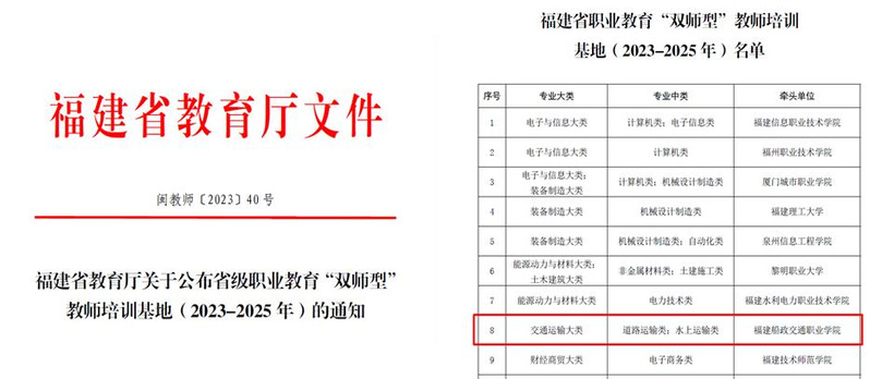 7月12日,福建省教育廳印發(fā)《關(guān)于公布省級職業(yè)教育“雙師型”教師培訓(xùn)基地(2023-2025年)的通知》,我校依托航海技術(shù)高水平專業(yè)群,獲批福建省職業(yè)教育“雙師型”教師培訓(xùn)基地(2023-2025年),開展水上運輸類的“雙師型”教師培訓(xùn)與實踐。福建省職業(yè)教育“雙師型”教師培訓(xùn)基地是我省職業(yè)院校教師發(fā)展體系的重要組成部分,是承擔(dān)省級及以上職業(yè)院校教師素質(zhì)提高計劃培訓(xùn)任務(wù)的重要載體。