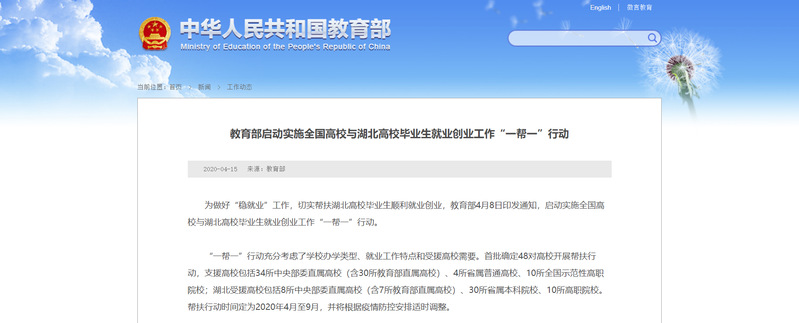 據(jù)悉,“一幫一”行動充分考慮了學(xué)校辦學(xué)類型、就業(yè)工作特點和受援高校需要。首批確定48對高校開展幫扶行動,支援高校包括34所中央部委直屬高校(含30所教育部直屬高校)、4所省屬普通高校、10所全國示范性高職院校;湖北受援高校包括8所中央部委直屬高校(含7所教育部直屬高校)、30所省屬本科院校、10所高職院校。幫扶行動時間定為2020年4月至9月,并將根據(jù)疫情防控安排適時調(diào)整。