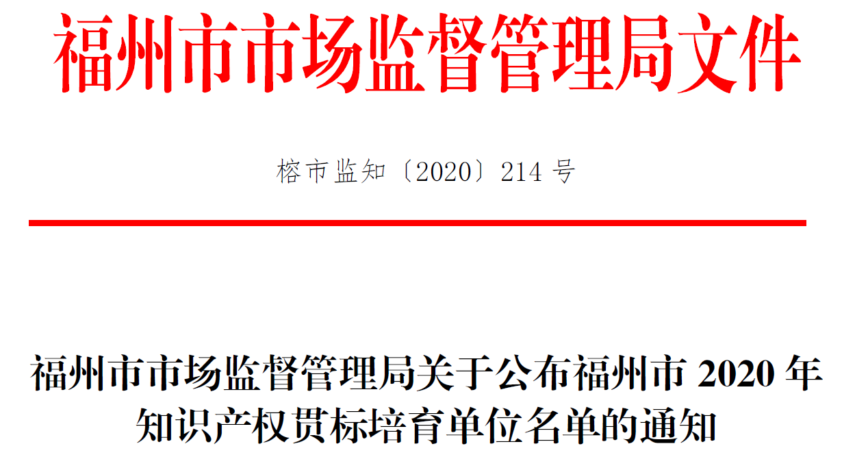根據(jù)國家、省、市相關(guān)疫情期間支持復工復產(chǎn)文件通知要求和《福州市自主知識產(chǎn)權(quán)資助和獎勵辦法》(榕政綜[2018]210號)精神,經(jīng)申請,福州市知識產(chǎn)權(quán)局、市場監(jiān)管局推薦,我校被確定福州市2020 年知識產(chǎn)權(quán)貫標培育單位。