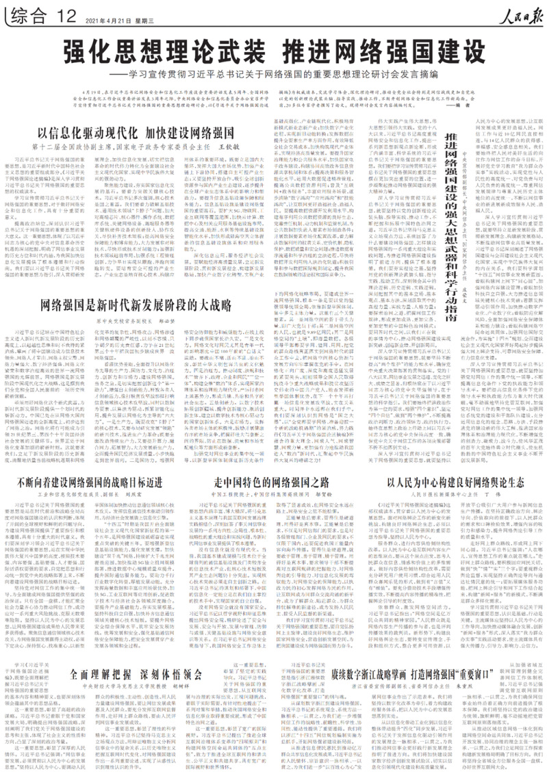 4月19日,在習(xí)近平總書記網(wǎng)絡(luò)安全和信息化工作座談會重要講話發(fā)表5周年、全國網(wǎng)絡(luò)安全和信息化工作會議重要講話發(fā)表3周年之際,中央網(wǎng)絡(luò)安全和信息化委員會辦公室召開學(xué)習(xí)宣傳貫徹習(xí)近平總書記關(guān)于網(wǎng)絡(luò)強(qiáng)國的重要思想理論研討會,以《習(xí)近平關(guān)于網(wǎng)絡(luò)強(qiáng)國論述摘編》為權(quán)威讀本,交流學(xué)習(xí)體會,深化理論研討,推動全黨全社會特別是網(wǎng)信戰(zhàn)線更加自覺地以黨的創(chuàng)新理論武裝頭腦、指導(dǎo)實(shí)踐、推動工作,不斷開創(chuàng)網(wǎng)絡(luò)安全和信息化工作新局面。會前,20多位專家學(xué)者撰寫了論文。4月21日出版的人民日報(bào)專版摘編刊發(fā)理論研討會發(fā)言內(nèi)容。
